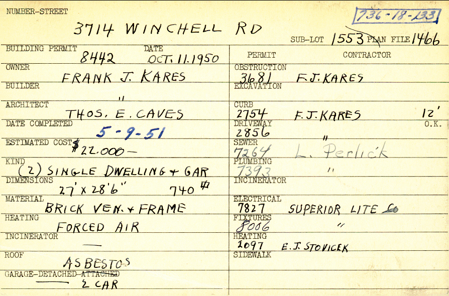 3714 Winchell Road Shaker Heights, OH 44122 PARCEL ID: 736-18-133 Building Permit Date: 10-11-1950 Plan File Number: 1466 all scanned Microfilm Roll: Roll017 Neighborhood: Lomond Owner: Kares, Frank J. Builder: Kares, Frank J. Architect: Caves, Thomas E. Estimated Cost: 22000 Date Completed: 05-09-1951 Kind: Single Dwelling and Garage (2) Material: Brick Veneer and Frame Heating: Forced Air Roof: Asbestos Garage: detached 2 car |