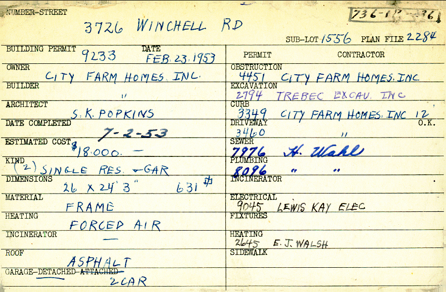 3726 Winchell Road Shaker Heights, OH 44122 PARCEL ID: 736-18-136 Building Permit Date: 02-23-1953 Plan File Number: 2284 Neighborhood: Lomond Owner: City Farm Homes, Inc. Builder: City Farm Homes, Inc. Architect: Popkins, S. K. Estimated Cost: 18000 Date Completed: 07-02-1953 Kind: Single Dwelling and Garage (2) Material: Frame Heating: Forced Air Roof: Asphalt Garage: detached 2 car |