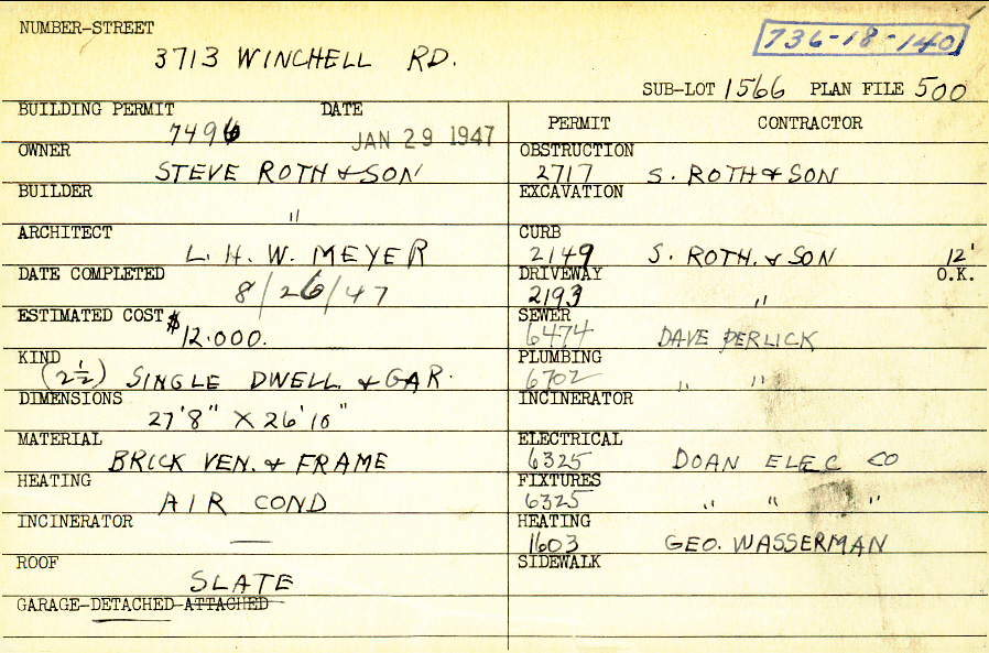 3713 Winchell Road Shaker Heights, OH 44122 PARCEL ID: 736-18-140 Building Permit Date: 01-29-1947 Plan File Number: 500, 504 all scanned Microfilm Roll: Roll007 Neighborhood: Lomond Owner: Steve Roth and Son Builder: Steve Roth and Son Architect: Meyer, L. H. W. Estimated Cost: 12000 Date Completed: 08-26-1947 Kind: Single 2-1/2 Material: Brick Veneer and Frame Heating: Air Conditioned Roof: Slate Garage: detached |