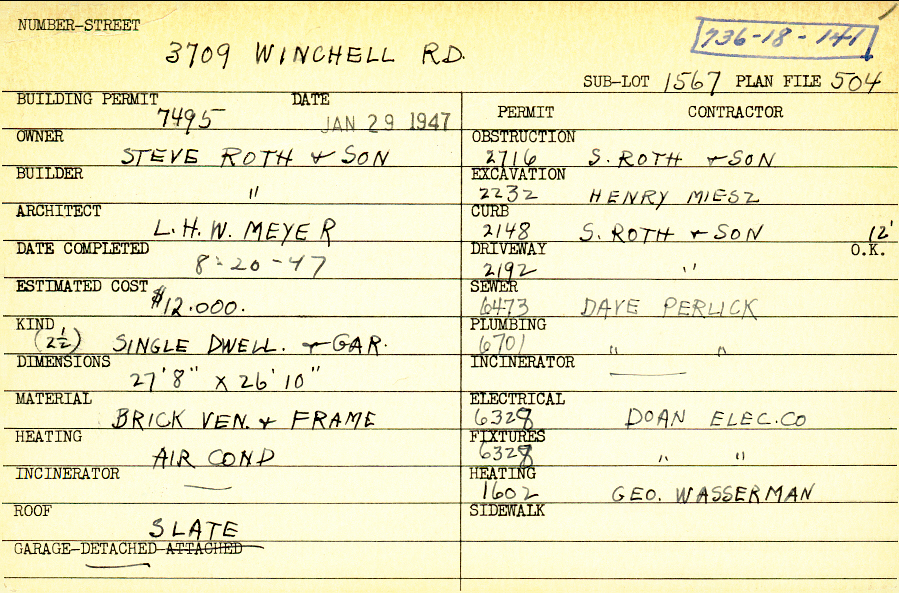 3709 Winchell Road Shaker Heights, OH 44122 PARCEL ID: 736-18-141 Building Permit Date: 01-29-1947 Plan File Number: 504, 505 all scanned Microfilm Roll: Roll007 Neighborhood: Lomond Owner: Steve Roth and Son Builder: Steve Roth and Son Architect: Meyer, L. H. W. Estimated Cost: 12000 Date Completed: 08-20-1947 Kind: Single 2-1/2 Material: Brick Veneer and Frame Heating: Air Conditioned Roof: Slate Garage: detached |