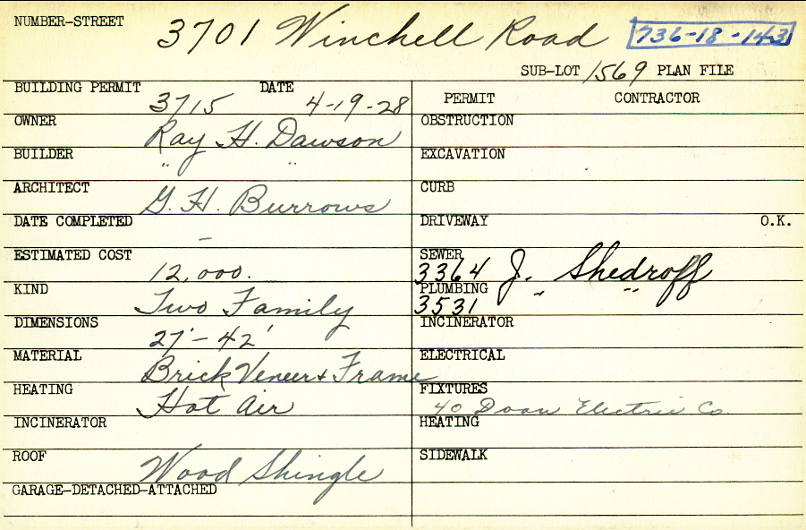 3701 Winchell Road Shaker Heights, OH 44122 PARCEL ID: 736-18-143 Building Permit Date: 04-19-1928 Plan File Number: 0 Neighborhood: Lomond Owner: Dawson, Ray H. Builder: Dawson, Ray H. Architect: Burrows, G. H. Estimated Cost: 12000 Kind: Duplex or Two-Family Material: Brick Veneer and Frame Heating: Hot Air Roof: Wood Shingle |