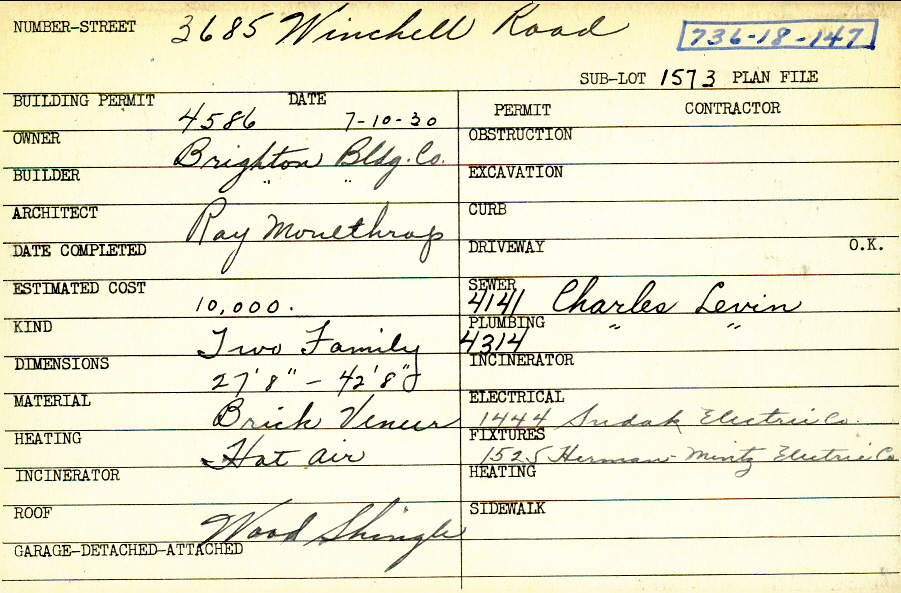3685 Winchell Road Shaker Heights, OH 44122 PARCEL ID: 736-18-147 Building Permit Date: 07-10-1930 Plan File Number: 0 Neighborhood: Lomond Owner: Brighton Building Company Builder: Brighton Building Company Architect: Moulthrop, Ray Estimated Cost: 10000 Kind: Duplex or Two-Family Material: Brick Veneer Heating: Hot Air Roof: Wood Shingle |