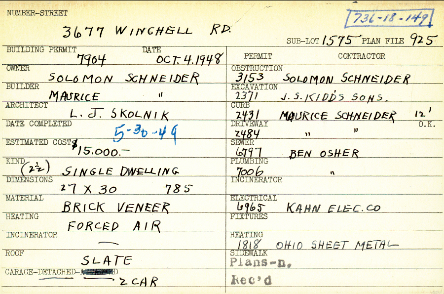 3677 Winchell Road Shaker Heights, OH 44122 PARCEL ID: 736-18-149 Building Permit Date: 10-04-1948 Plan File Number: 925 all scanned Microfilm Roll: Roll012 Neighborhood: Lomond Owner: Schneider, Solomon Builder: Schneider, Maurice Architect: Skolnik, Louis Estimated Cost: 15000 Date Completed: 05-30-1949 Kind: Single 2-1/2 Material: Brick Veneer Heating: Forced Air Roof: Slate Garage: detached 2 car |