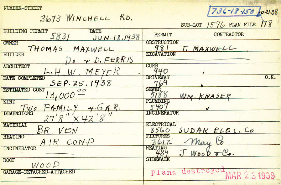 3673 Winchell Road Shaker Heights, OH 44122 PARCEL ID: 736-18-150 Building Permit Date: 06-18-1938 Neighborhood: Lomond Owner: Maxwell, Thomas Builder: Maxwell, Thomas and Ferris, D. Architect: Meyer, L. H. W. Estimated Cost: 13000 Date Completed: 09-25-1938 Kind: Duplex or Two-Family and Garage Material: Brick Veneer Heating: Air Conditioned Roof: Wood Garage: detached Blueprints: no blueprints on microfilm |