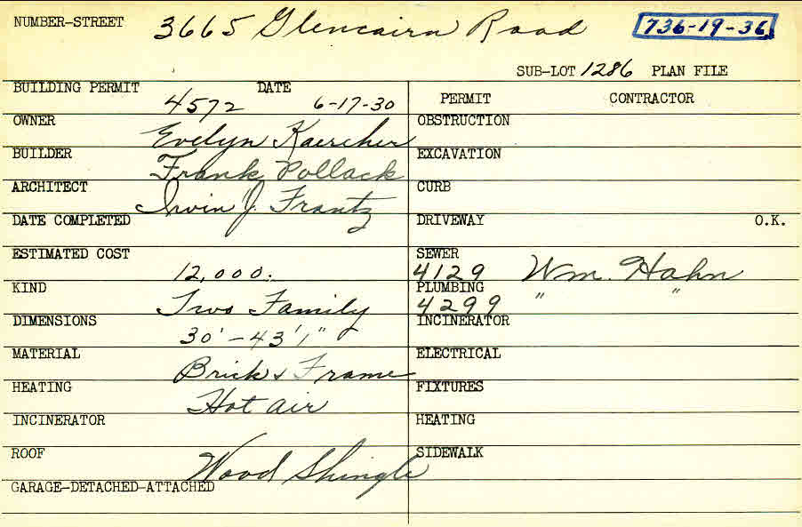 3665 Glencairn Road Shaker Heights, OH 44122 PARCEL ID: 736-19-036 Building Permit Date: 06-17-1930 Plan File Number: 0 Neighborhood: Fernway Owner: Kaercher, Evelyn Builder: Pollack, Frank Architect: Frantz, Irvin J. Estimated Cost: 12000 Kind: Duplex or Two-Family Material: Brick and Frame Heating: Hot Air Roof: Wood Shingle Card Available: yes |