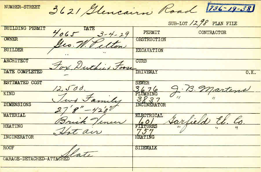 3621 Glencairn Road Shaker Heights, OH 44122 PARCEL ID: 736-19-038 Building Permit Date: 03-04-1929 Plan File Number: 0 Neighborhood: Fernway Owner: Pelton, George W. Builder: Pelton, George W. Architect: Fox, Duthie and Foose Estimated Cost: 12500 Kind: Duplex or Two-Family Material: Brick Veneer Heating: Hot Air Roof: Slate Card Available: yes |