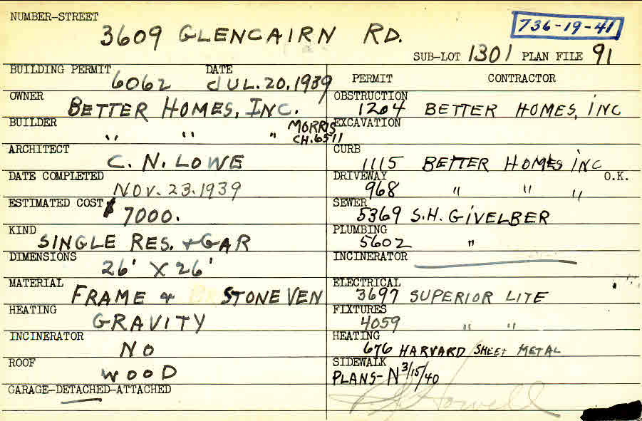 3609 Glencairn Road Shaker Heights, OH 44122 PARCEL ID: 736-19-041 Building Permit Date: 07-20-1939 Plan File Number: 91 Neighborhood: Fernway Owner: Better Homes, Inc. Builder: Better Homes, Inc. - Morris Architect: Lowe, C. N. Estimated Cost: 7000 Date Completed: 11-23-1939 Kind: Single Dwelling and Garage Material: Frame and Stone Veneer Heating: Gravity System Roof: Wood Garage: detached |