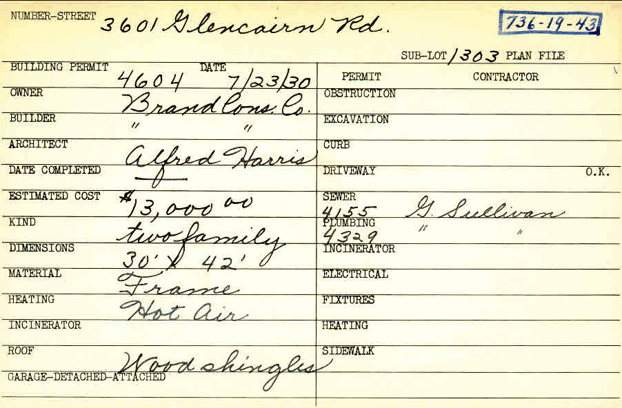 3601 Glencairn Road Shaker Heights, OH 44122 PARCEL ID: 736-19-043 Building Permit Date: 07-23-1930 Plan File Number: 0 Neighborhood: Fernway Owner: Brand Construction Company Builder: Brand Construction Company Architect: Harris, Alfred Estimated Cost: 13000 Kind: Duplex or Two-Family Material: Frame Heating: Hot Air Roof: Wood Shingle Card Available: yes |