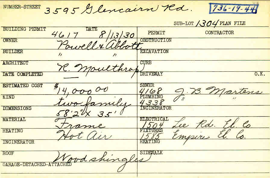 3595 Glencairn Road Shaker Heights, OH 44122 PARCEL ID: 736-19-044 Building Permit Date: 08-13-1930 Plan File Number: 0 Neighborhood: Fernway Owner: Powell and Abbott Builder: Powell and Abbott Architect: Moulthrop, R. Estimated Cost: 14000 Kind: Duplex or Two-Family Material: Frame Heating: Hot Air Roof: Wood Shingle |