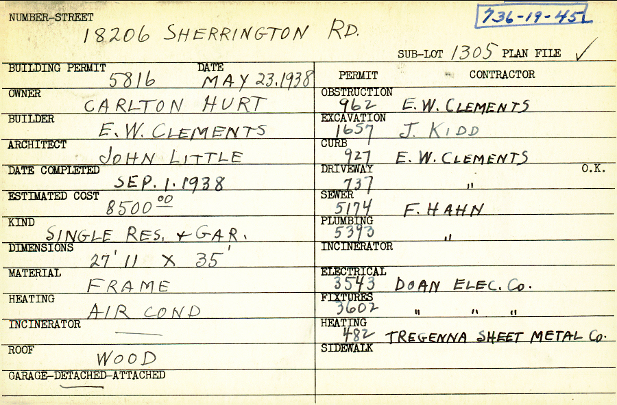 18206 Sherrington Road Shaker Heights, OH 44122 PARCEL ID: 736-19-045 Building Permit Date: 05-23-1938 Plan File Number: 3740 Microfilm Roll: Roll#51 Neighborhood: Lomond Owner: Hurt, Carlton Builder: Clements, E. W. Architect: Little, John W. Estimated Cost: 8500 Date Completed: 09-01-1938 Kind: Single Dwelling and Garage Material: Frame Heating: Air Conditioned Roof: Wood Garage: detached |