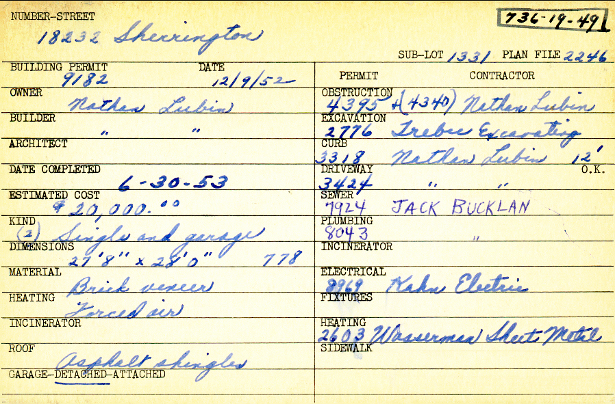 18232 Sherrington Road Shaker Heights, OH 44122 PARCEL ID: 736-19-049 Building Permit Date: 12-09-1952 Plan File Number: 2246 Microfilm Roll: Roll#33 Neighborhood: Lomond Owner: Lubin, Nathan Builder: Lubin, Nathan Estimated Cost: 20000 Date Completed: 06-30-1953 Kind: Single Dwelling and Garage (2) Material: Brick Veneer Heating: Forced Air Roof: Asphalt Shingles Garage: detached |