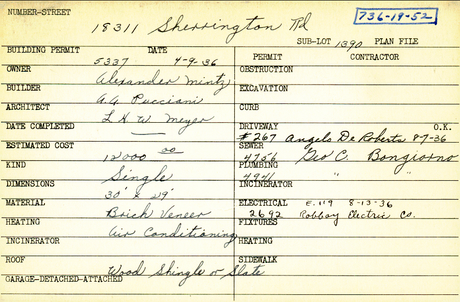 18311 Sherrington Road Shaker Heights, OH 44122 PARCEL ID: 736-19-052 Building Permit Date: 04-09-1936 Plan File Number: 0 Neighborhood: Lomond Owner: Mintz, Alexander Builder: Pucciani, A. A. Architect: Meyer, L. H. W. Estimated Cost: 12000 Kind: Single, Single Residence or Dwelling Material: Brick Veneer Heating: Air Conditioned Roof: Wood Shingle |