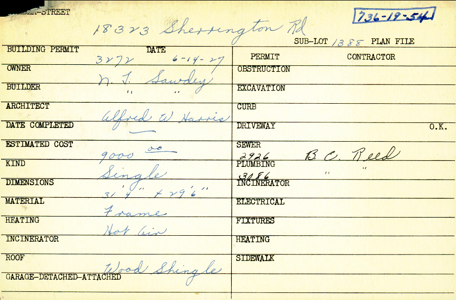 18323 Sherrington Road Shaker Heights, OH 44122 PARCEL ID: 736-19-054 Building Permit Date: 06-14-1927 Plan File Number: 0 Neighborhood: Lomond Owner: Sawdey, N. T. Builder: Sawdey, N. T. Architect: Harris, Alfred W. Estimated Cost: 9000 Kind: Single, Single Residence or Dwelling Material: Frame Heating: Hot Air Roof: Wood Shingle |