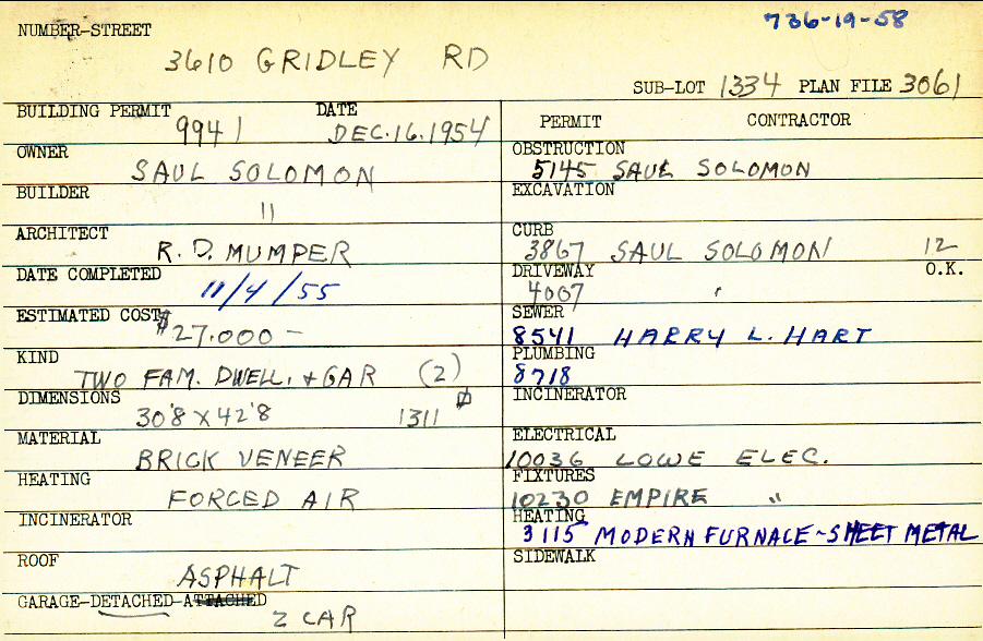 3610 Gridley Road Shaker Heights, OH 44122 PARCEL ID: 736-19-058 Building Permit Date: 12-16-1954 Plan File Number: 3061 Microfilm Roll: Roll#43 Neighborhood: Lomond Owner: Solomon, Saul Builder: Solomon, Saul Architect: Mumper, R. D. Estimated Cost: 27000 Date Completed: 11-04-1955 Kind: Duplex or Two-Family and Garage Material: Brick Veneer Heating: Forced Air Roof: Asphalt Garage: detached 2 car |