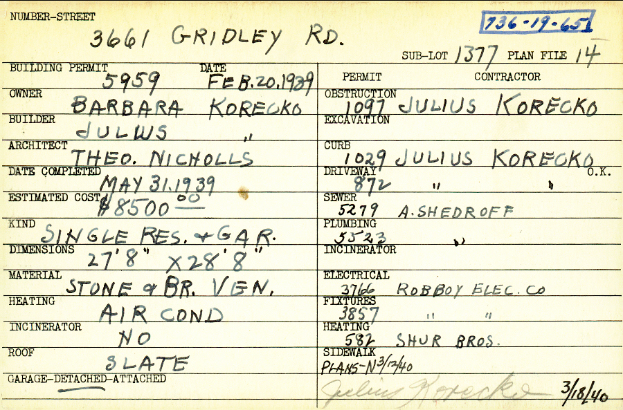 3661 Gridley Road Shaker Heights, OH 44122 PARCEL ID: 736-19-065 Building Permit Date: 02-20-1939 Neighborhood: Lomond Owner: Korecko, Barbara Builder: Korecko, Julius Architect: Nicholls, Theodore Estimated Cost: 8500 Date Completed: 05-31-1939 Kind: Single Dwelling and Garage Material: Stone and Brick Veneer Heating: Air Conditioned Roof: Slate Garage: detached Blueprints: no blueprints on microfilm |