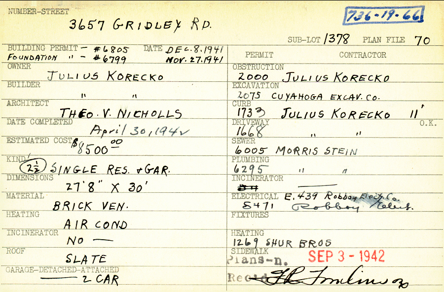 3657 Gridley Road Shaker Heights, OH 44122 PARCEL ID: 736-19-066 Building Permit Date: 12-08-1941 Plan File Number: 70 Neighborhood: Lomond Owner: Korecko, Julius Builder: Korecko, Julius Architect: Nichols, Theodore V. Estimated Cost: 8500 Date Completed: 04-30-1942 Kind: Single Dwelling and Garage (2) Material: Brick Veneer Heating: Air Conditioned Roof: Slate Garage: detached 2 car |