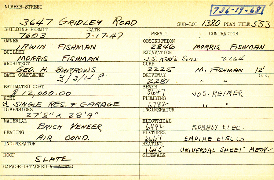 3647 Gridley Road Shaker Heights, OH 44122 PARCEL ID: 736-19-068 Building Permit Date: 07-17-1947 Plan File Number: 553 all scanned Microfilm Roll: Roll007 Neighborhood: Lomond Owner: Fishman, Irwin Builder: Fishman, Morris Architect: Burrows, George H. Estimated Cost: 12000 Date Completed: 03-03-1948 Kind: Single Dwelling and Garage (2) Material: Brick Veneer Heating: Air Conditioned Roof: Slate Garage: detached |