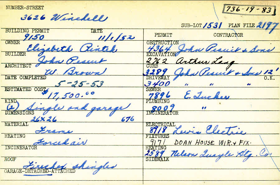 3626 Winchell Road Shaker Heights, OH 44122 PARCEL ID: 736-19-083 Building Permit Date: 11-01-1952 Plan File Number: 2197 Microfilm Roll: Roll#33 Neighborhood: Lomond Owner: Pintek, Elizabeth Builder: Pesuit, John Architect: Brown, W. Estimated Cost: 17500 Date Completed: 05-25-1953 Kind: Single Dwelling and Garage (2) Material: Frame Heating: Forced Air Roof: Asphalt Shingles Garage: detached |