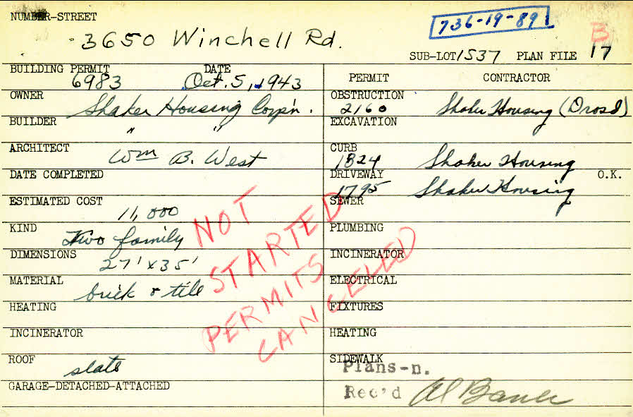 3650 Winchell Road Shaker Heights, OH 44122 PARCEL ID: 736-19-089 Building Permit Date: 10-05-1943 Plan File Number: 17, 6585 Microfilm Roll: Roll#86 Neighborhood: Lomond Owner: Shaker Housing Corporation Builder: Shaker Housing Corporation Architect: West, William B. Estimated Cost: 11000 Kind: Duplex or Two-Family Material: Brick and Tile Roof: Slate |