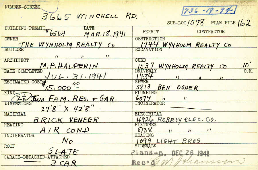 3665 Winchell Road Shaker Heights, OH 44122 PARCEL ID: 736-19-094 Building Permit Date: 03-18-1941 Neighborhood: Lomond Owner: The Wynholm Realty Company Builder: The Wynholm Realty Company Architect: Halperin, M. P. Estimated Cost: 15000 Date Completed: 07-31-1941 Kind: Duplex or Two-Family and Garage Material: Brick Veneer Heating: Air Conditioned Roof: Slate Garage: detached 3 car Blueprints: no blueprints on microfilm |