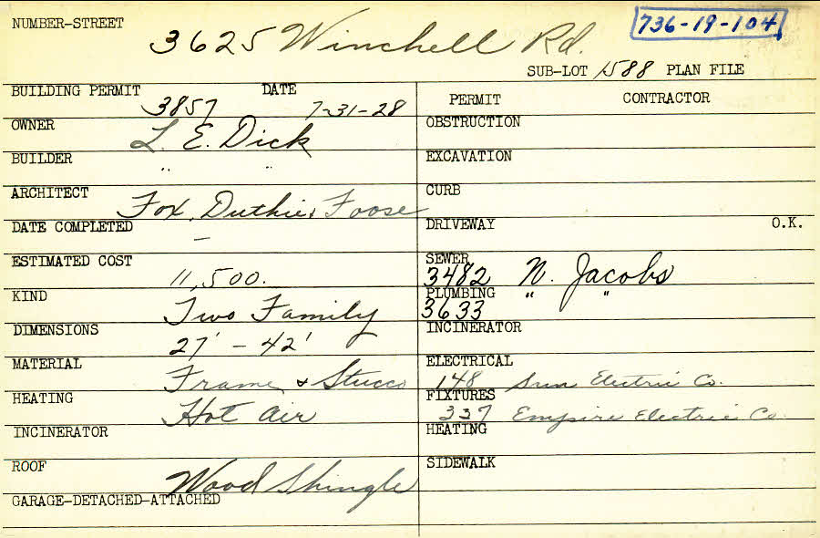 3625 Winchell Road Shaker Heights, OH 44122 PARCEL ID: 736-19-104 Building Permit Date: 07-31-1928 Plan File Number: 4552 Microfilm Roll: Roll#63 Neighborhood: Lomond Owner: Dick, L. E. Builder: Dick, L. E. Architect: Fox, Duthie and Foose Estimated Cost: 11500 Kind: Duplex or Two-Family Material: Frame and Stucco Heating: Hot Air Roof: Wood Shingle |