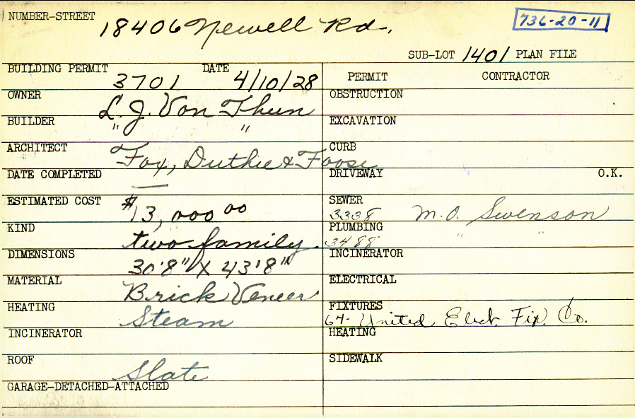 18406 Newell Road Shaker Heights, OH 44122 PARCEL ID: 736-20-011 Building Permit Date: 04-10-1928 Plan File Number: 0 Neighborhood: Lomond Owner: Von Thun, L. J. Builder: Von Thun, L. J. Architect: Fox, Duthie and Foose Estimated Cost: 13000 Kind: Duplex or Two-Family Material: Brick Veneer Heating: Steam Roof: Slate |