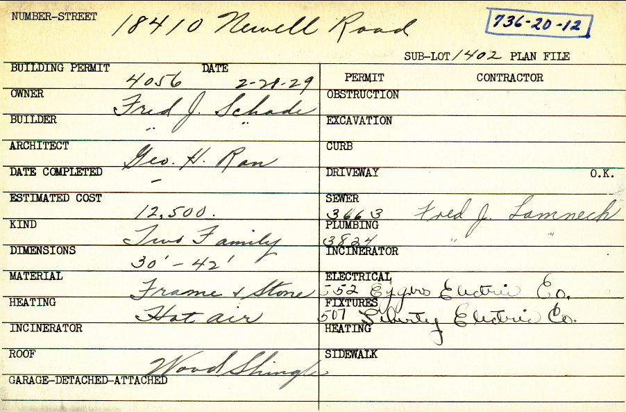 18410 Newell Road Shaker Heights, OH 44122 PARCEL ID: 736-20-012 Building Permit Date: 02-28-1929 Plan File Number: 0 Neighborhood: Lomond Owner: Schade, Fred J. Builder: Schade, Fred J Architect: Rau, George H. Estimated Cost: 12500 Kind: Duplex or Two-Family Material: Frame and Stone Heating: Hot Air Roof: Wood Shingle |
