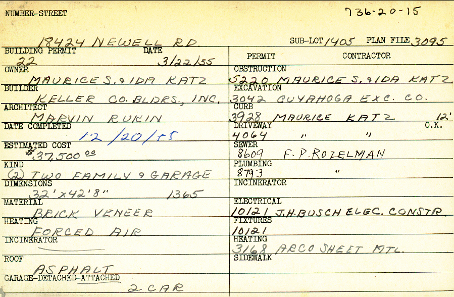 18424 Newell Road Shaker Heights, OH 44122 PARCEL ID: 736-20-015 Building Permit Date: 03-22-1955 Plan File Number: 3095 Microfilm Roll: Roll#43 Neighborhood: Lomond Owner: Katz, Maurice S. and Ida Builder: Keller Company Builders, Inc Architect: Rukin, Marvin Estimated Cost: 37500 Date Completed: 12-20-1955 Kind: Duplex or Two-Family and Garage Material: Brick Veneer Heating: Forced Air Roof: Asphalt Garage: attached 2 car |