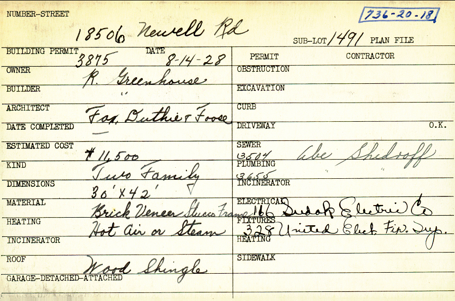 18506 Newell Road Shaker Heights, OH 44122 PARCEL ID: 736-20-018 Building Permit Date: 08-14-1928 Plan File Number: 6243 Microfilm Roll: Roll#84 Neighborhood: Lomond Owner: Greenhouse, R. Builder: Greenhouse, R. Architect: Fox, Duthie and Foose Estimated Cost: 11500 Kind: Duplex or Two-Family Material: Brick Veneer, Stucco Frame Heating: Hot Air Roof: Wood Shingle |