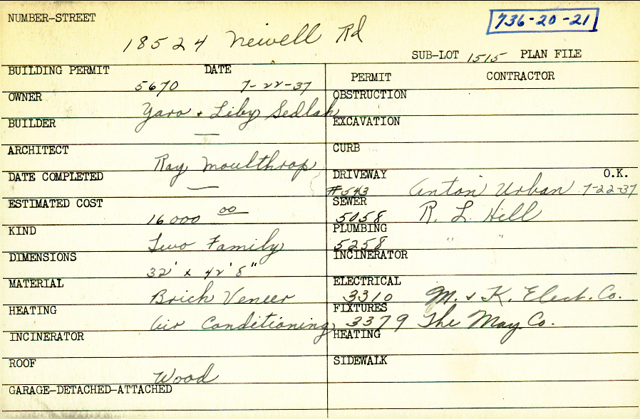 18524 Newell Road Shaker Heights, OH 44122 PARCEL ID: 736-20-021 Building Permit Date: 07-22-1937 Plan File Number: 0 Neighborhood: Lomond Owner: Sedlak, Yaro and Liby Builder: Sedlak, Yaro and Liby Architect: Moulthrop, Ray Estimated Cost: 16000 Kind: Duplex or Two-Family Material: Brick Veneer Heating: Air Conditioned Roof: Wood |