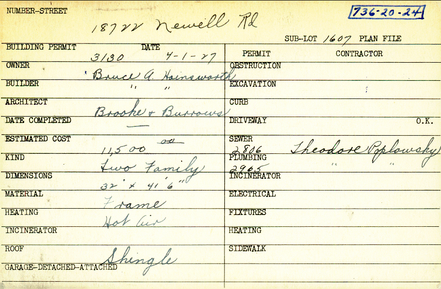 18722 Newell Road Shaker Heights, OH 44122 PARCEL ID: 736-20-024 Building Permit Date: 04-01-1927 Plan File Number: 1425 all scanned Microfilm Roll: Roll016 Neighborhood: Sussex Owner: Hainsworth, Bruce A. Builder: Hainsworth, Bruce A. Architect: Brooke and Burrows Estimated Cost: 11500 Kind: Duplex or Two-Family Material: Frame Heating: Hot Air Roof: Shingles |