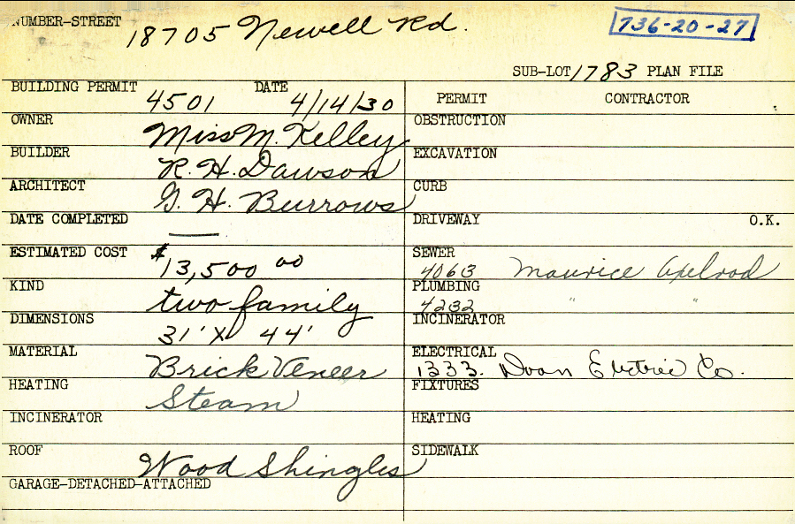 18705 Newell Road Shaker Heights, OH 44122 PARCEL ID: 736-20-027 Building Permit Date: 04-14-1930 Plan File Number: 0 Neighborhood: Lomond Owner: Kelley, Miss M. Builder: Dawson, R. H. Architect: Burrows, G. H. Estimated Cost: 13500 Kind: Duplex or Two-Family Material: Brick Veneer Heating: Steam Roof: Wood Shingle |