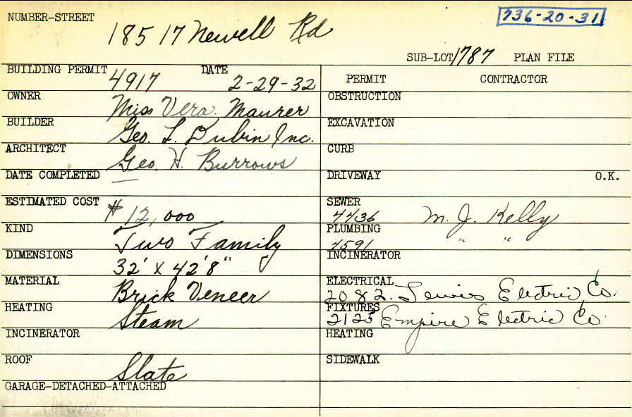 18517 Newell Road Shaker Heights, OH 44122 PARCEL ID: 736-20-031 Building Permit Date: 02-29-1932 Plan File Number: 0 Neighborhood: Lomond Owner: Maurer, Miss Vera Builder: George L. Dubin, Inc Architect: Burrows, George H. Estimated Cost: 12000 Kind: Duplex or Two-Family Material: Brick Veneer Heating: Steam Roof: Slate |