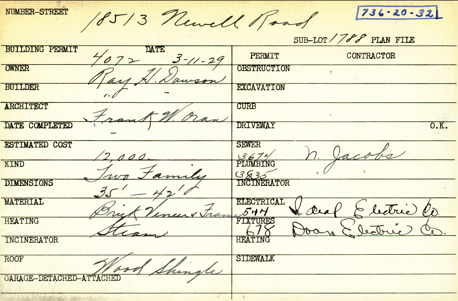 18513 Newell Road Shaker Heights, OH 44122 PARCEL ID: 736-20-032 Building Permit Date: 03-11-1929 Plan File Number: 0 Neighborhood: Lomond Owner: Dawson, Ray H. Builder: Dawson, Ray H. Architect: Oran, Frank W. Estimated Cost: 12000 Kind: Duplex or Two-Family Material: Brick Veneer and Frame Heating: Steam Roof: Wood Shingle |