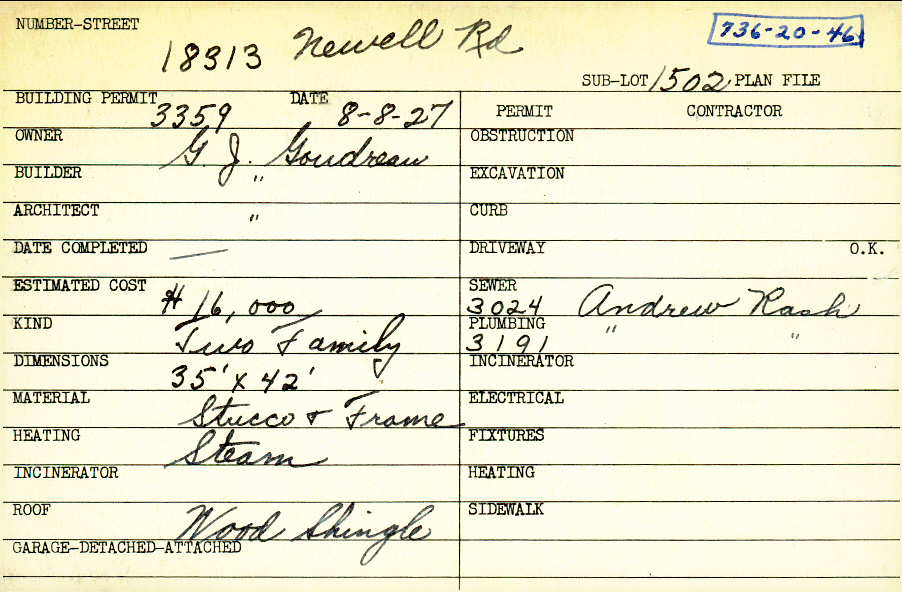 18313 Newell Road Shaker Heights, OH 44122 PARCEL ID: 736-20-046 Building Permit Date: 08-08-1927 Plan File Number: 0 Neighborhood: Lomond Owner: Goudreau, G. J. Builder: Goudreau, G. J. Architect: Goudreau, G. J. Estimated Cost: 16000 Kind: Duplex or Two-Family Material: Stucco and Frame Heating: Steam Roof: Wood Shingle |