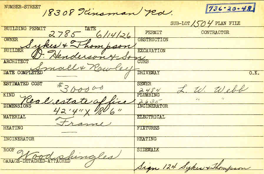 18308 Chagrin Boulevard Shaker Heights, OH 44122 PARCEL ID: 736-20-048 Building Permit Date: 06-14-1926 Plan File Number: 435 scanned, 7714 Microfilm Roll: Roll004, Roll#94 Neighborhood: Lomond Owner: Sykes and Thompson Builder: D. Henderson and Son Architect: Small and Rowley Estimated Cost: 3000 Kind: Commercial - Retail or Office Material: Frame Roof: Wood Shingle |