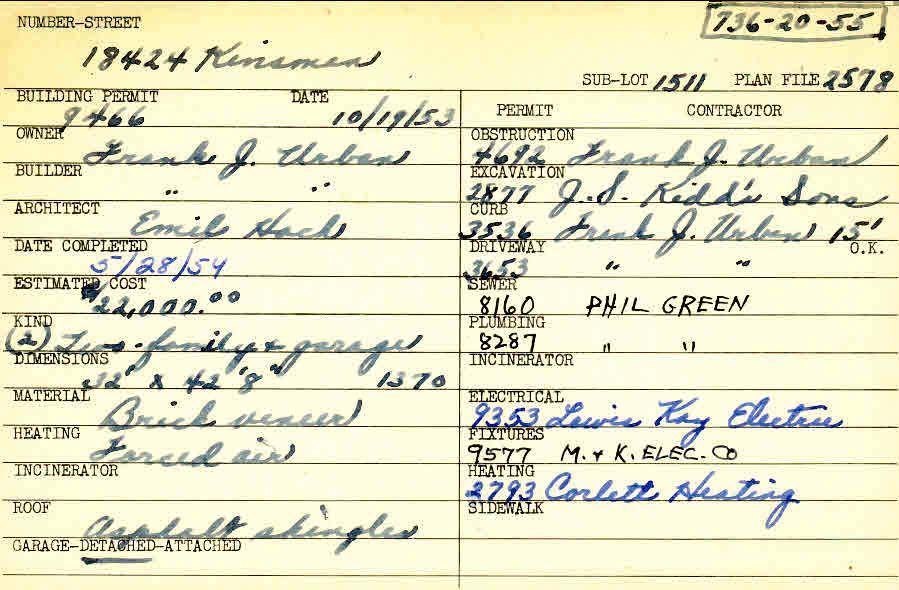18424 Chagrin Boulevard Shaker Heights, OH 44122 PARCEL ID: 736-20-055 Building Permit Date: 10-19-1953 Plan File Number: 2578, 5883 Microfilm Roll: Roll #36, Roll#79 Neighborhood: Lomond Owner: Urban, Frank J. Builder: Urban, Frank J. Architect: Hoch, Emil Estimated Cost: 22000 Date Completed: 05-28-1954 Kind: Duplex or Two-Family and Garage Material: Brick Veneer Heating: Forced Air Roof: Asphalt Shingles Garage: detached |