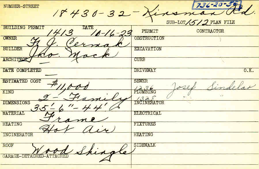 18430 Chagrin Boulevard Shaker Heights, OH 44122 PARCEL ID: 736-20-056 Building Permit Date: 10-16-1923 Neighborhood: Lomond Owner: Cermak, F. J. Builder: Mack, John Estimated Cost: 11000 Kind: Duplex or Two-Family Material: Frame Heating: Hot Air Roof: Wood Shingle Blueprints: no blueprints on microfilm |