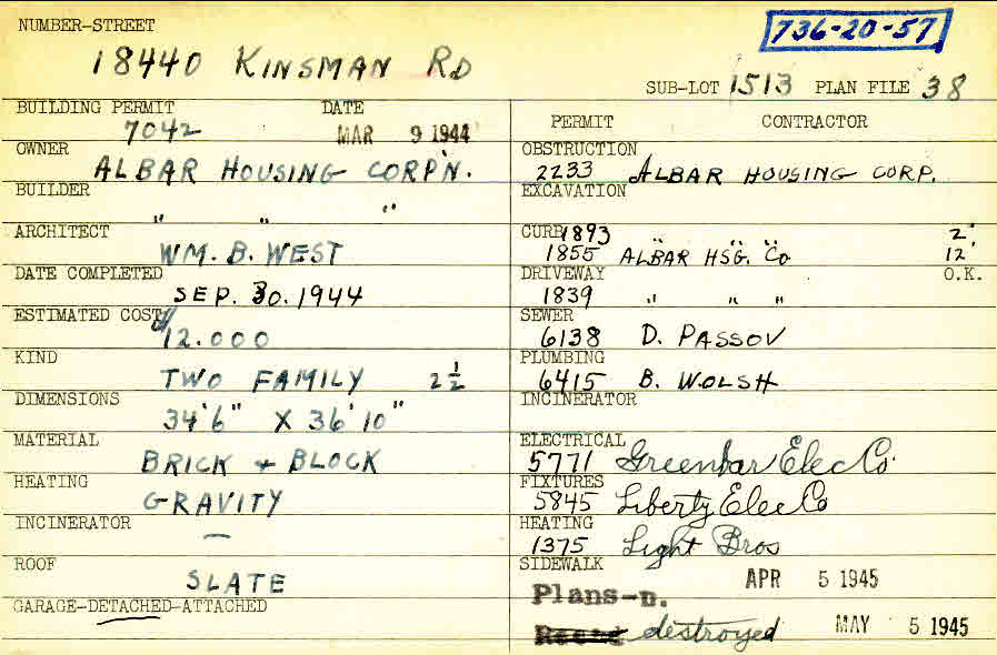 18440 Chagrin Boulevard Shaker Heights, OH 44122 PARCEL ID: 736-20-057 Building Permit Date: 03-09-1944 Plan File Number: 38 Neighborhood: Lomond Owner: Albar Housing Corporation Builder: Albar Housing Corporation Architect: West, William B. Estimated Cost: 12000 Date Completed: 09-30-1944 Kind: Duplex or Two-Family Material: Brick and Block Heating: Gravity System Roof: Slate Garage: detached |