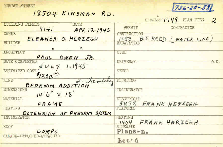 18504 Chagrin Boulevard Shaker Heights, OH 44122 PARCEL ID: 736-20-058 Building Permit Date: 04-12-1945 Plan File Number: 2 scanned Microfilm Roll: Roll001 Neighborhood: Lomond Owner: Herzegh, Eleanor O. Builder: Herzegh, Eleanor O. Architect: Owen, Paul Jr. Estimated Cost: 1200 Date Completed: 07-01-1945 Kind: Duplex or Two-Family Material: Frame |