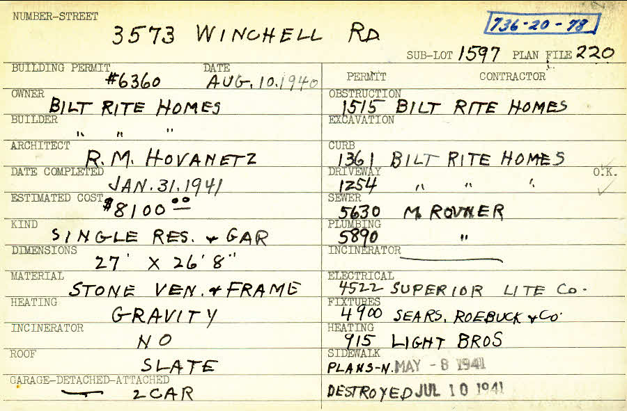3573 Winchell Road Shaker Heights, OH 44122 PARCEL ID: 736-20-078 Building Permit Date: 08-10-1940 Neighborhood: Lomond Owner: Bilt Rite Homes Company Builder: Bilt Rite Homes Company Architect: Hovanetz, R. M. Estimated Cost: 8100 Date Completed: 01-31-1941 Kind: Single Dwelling and Garage Material: Stone Veneer and Frame Heating: Gravity System Roof: Slate Garage: detached 2 car Blueprints: no blueprints on microfilm |