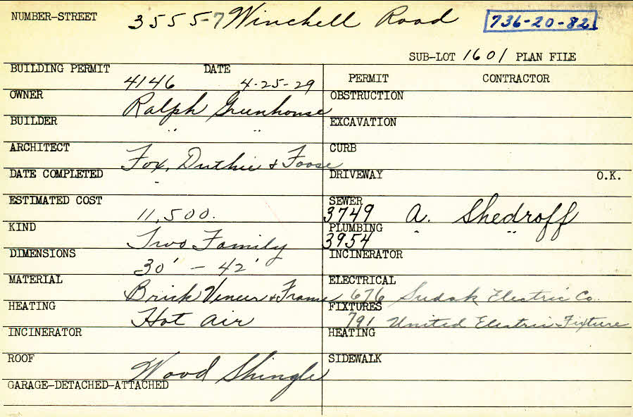 3555 Winchell Road Shaker Heights, OH 44122 PARCEL ID: 736-20-082 Building Permit Date: 04-25-1929 Plan File Number: 12776 Microfilm Roll: NewRoll#15 Neighborhood: Lomond Owner: Greenhouse, Ralph Builder: Greenhouse, Ralph Architect: Fox, Duthie and Foose Estimated Cost: 11500 Kind: Duplex or Two-Family Material: Brick Veneer and Frame Heating: Hot Air Roof: Wood Shingle |