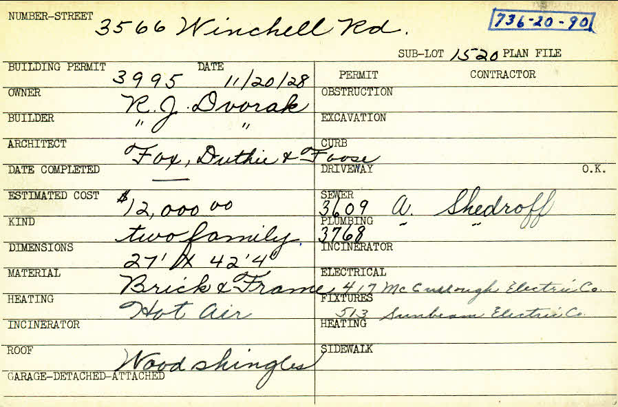 3566 Winchell Road Shaker Heights, OH 44122 PARCEL ID: 736-20-090 Building Permit Date: 11-20-1928 Plan File Number: 2861 scanned, 5319 Microfilm Roll: Roll041, Roll#73 Neighborhood: Lomond Owner: Dvorak, R. J. Builder: Dvorak, R. J. Architect: Fox, Duthie and Foose Estimated Cost: 12000 Kind: Duplex or Two-Family Material: Brick and Frame Heating: Hot Air Roof: Wood Shingle |