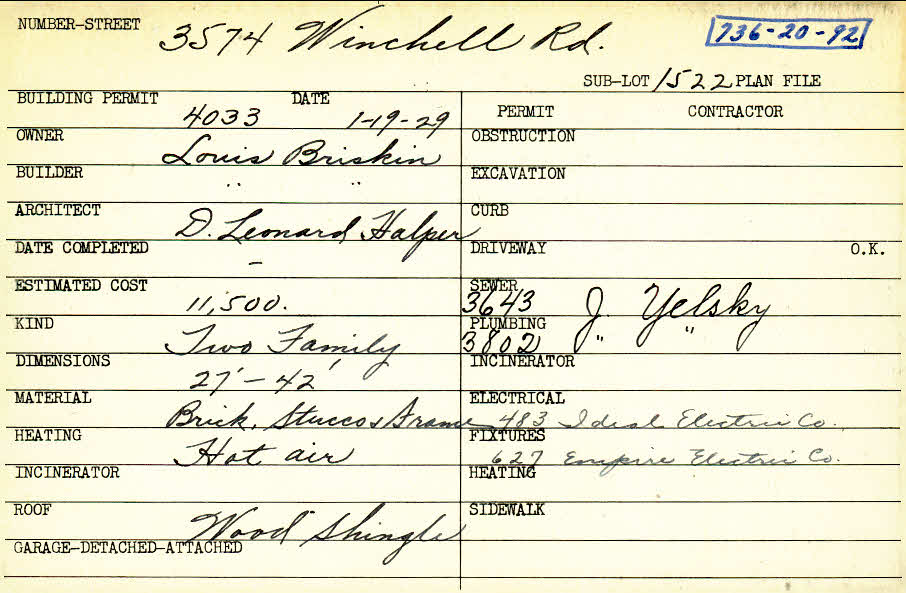 3574 Winchell Road Shaker Heights, OH 44122 PARCEL ID: 736-20-092 Building Permit Date: 01-19-1929 Plan File Number: 0 Neighborhood: Lomond Owner: Briskin, Louis Builder: Briskin, Louis Architect: Halper, D. Leonard Estimated Cost: 11500 Kind: Duplex or Two-Family Material: Brick, Stucco and Frame Heating: Hot Air Roof: Wood Shingle Card Available: yes |
