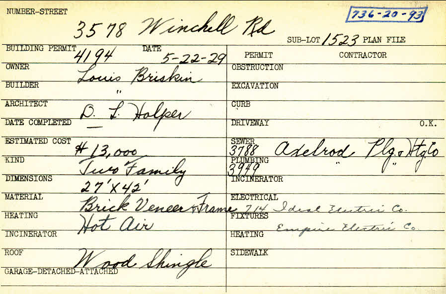 3578 Winchell Road Shaker Heights, OH 44122 PARCEL ID: 736-20-093 Building Permit Date: 05-22-1929 Plan File Number: 0 Neighborhood: Lomond Owner: Briskin, Louis Builder: Briskin, Louis Architect: Halper, D. L. Estimated Cost: 13000 Kind: Duplex or Two-Family Material: Brick Veneer and Frame Heating: Hot Air Roof: Wood Shingle Card Available: yes |