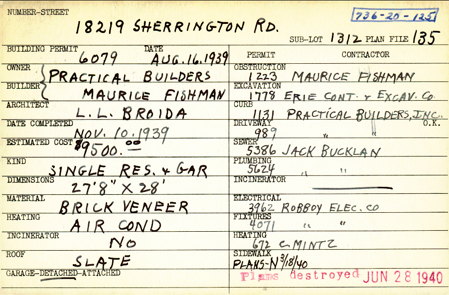 18219 Sherrington Road Shaker Heights, OH 44122 PARCEL ID: 736-20-125 Building Permit Date: 08-16-1939 Plan File Number: 135 Neighborhood: Lomond Owner: Practical Builders; Fishman, Maurice Builder: Practical Builders; Fishman, Maurice Architect: Broida, L. L. Estimated Cost: 9500 Date Completed: 11-10-1939 Kind: Single Dwelling and Garage Material: Brick Veneer Heating: Air Conditioned Roof: Slate Garage: detached |