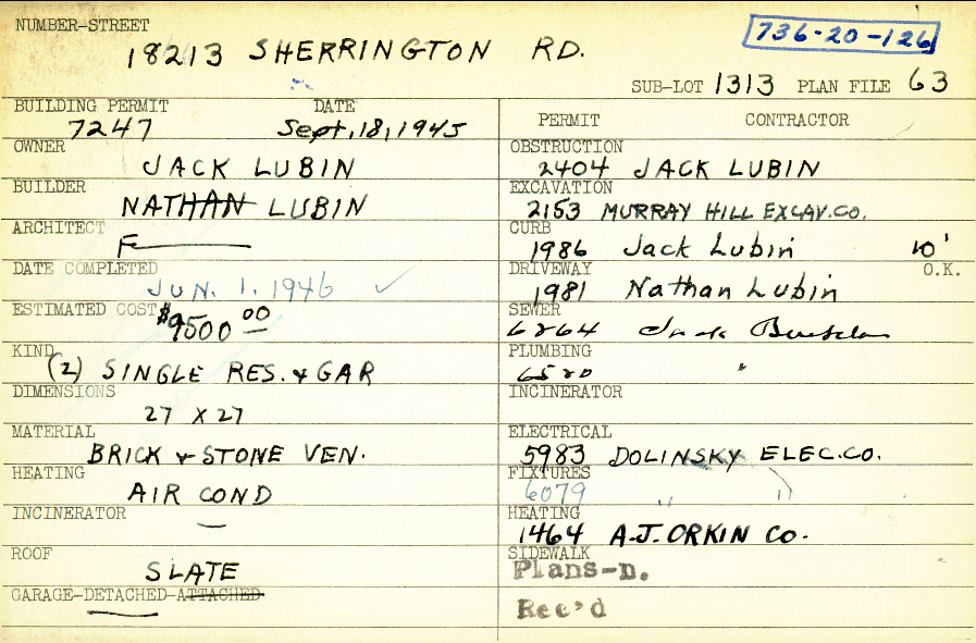 18213 Sherrington Road Shaker Heights, OH 44122 PARCEL ID: 736-20-126 Building Permit Date: 09-18-1945 Plan File Number: 63 scanned, 10019 Microfilm Roll: Roll001, Roll#105 Neighborhood: Lomond Owner: Lubin, Jack Builder: Lubin, Nathan Estimated Cost: 9500 Date Completed: 06-01-1946 Kind: Single Dwelling and Garage (2) Material: Brick and Stone Veneer Heating: Air Conditioned Roof: Slate Garage: detached |