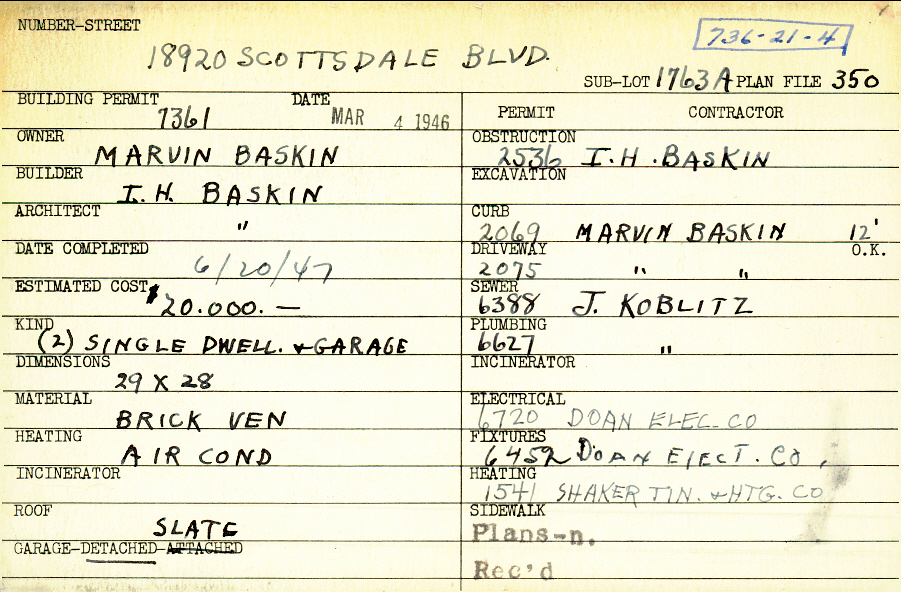 18920 Scottsdale Boulevard Shaker Heights, OH 44122 PARCEL ID: 736-21-004 Building Permit Date: 03-04-1946 Plan File Number: 349 all scanned Microfilm Roll: Roll004 Neighborhood: Sussex Owner: Baskin, Marvin Builder: Baskin, I. H. Architect: Baskin, I. H. Estimated Cost: 20000 Date Completed: 06-20-1947 Kind: Single Dwelling and Garage (2) Material: Brick Veneer Heating: Air Conditioned Roof: Slate Garage: detached |