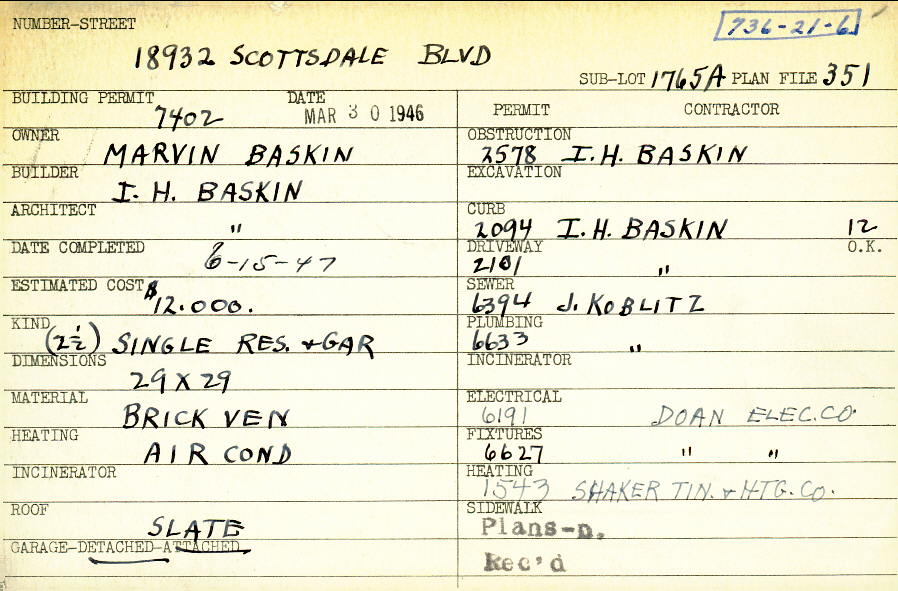 18932 Scottsdale Boulevard Shaker Heights, OH 44122 PARCEL ID: 736-21-006 Building Permit Date: 03-30-1946 Plan File Number: 351 all scanned Microfilm Roll: Roll004 Neighborhood: Sussex Owner: Baskin, Marvin Builder: Baskin, I. H. Architect: Baskin, I. H. Estimated Cost: 12000 Date Completed: 06-15-1947 Kind: Single 2-1/2 Material: Brick Veneer Heating: Air Conditioned Roof: Slate Garage: detached |