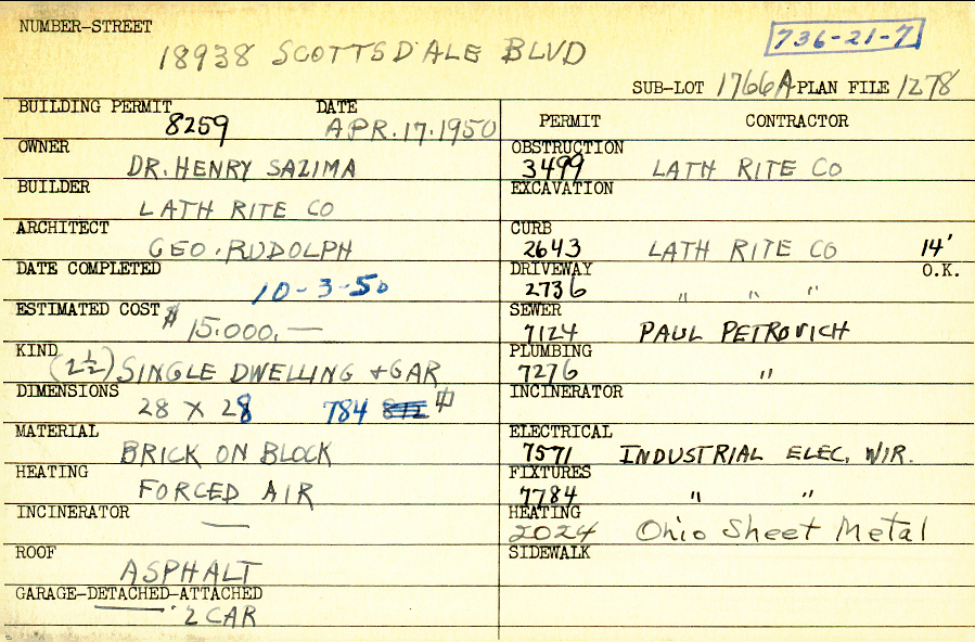 18938 Scottsdale Boulevard Shaker Heights, OH 44122 PARCEL ID: 736-21-007 Building Permit Date: 04-17-1950 Plan File Number: 1278 all scanned Microfilm Roll: Roll015 Neighborhood: Sussex Owner: Sazima, Dr. Henry Builder: Lath Rite Company Architect: Rudolph, George Estimated Cost: 15000 Date Completed: 10-03-1950 Kind: Single 2-1/2 Material: Brick on Block Heating: Forced Air Roof: Asphalt Garage: detached 2 car |